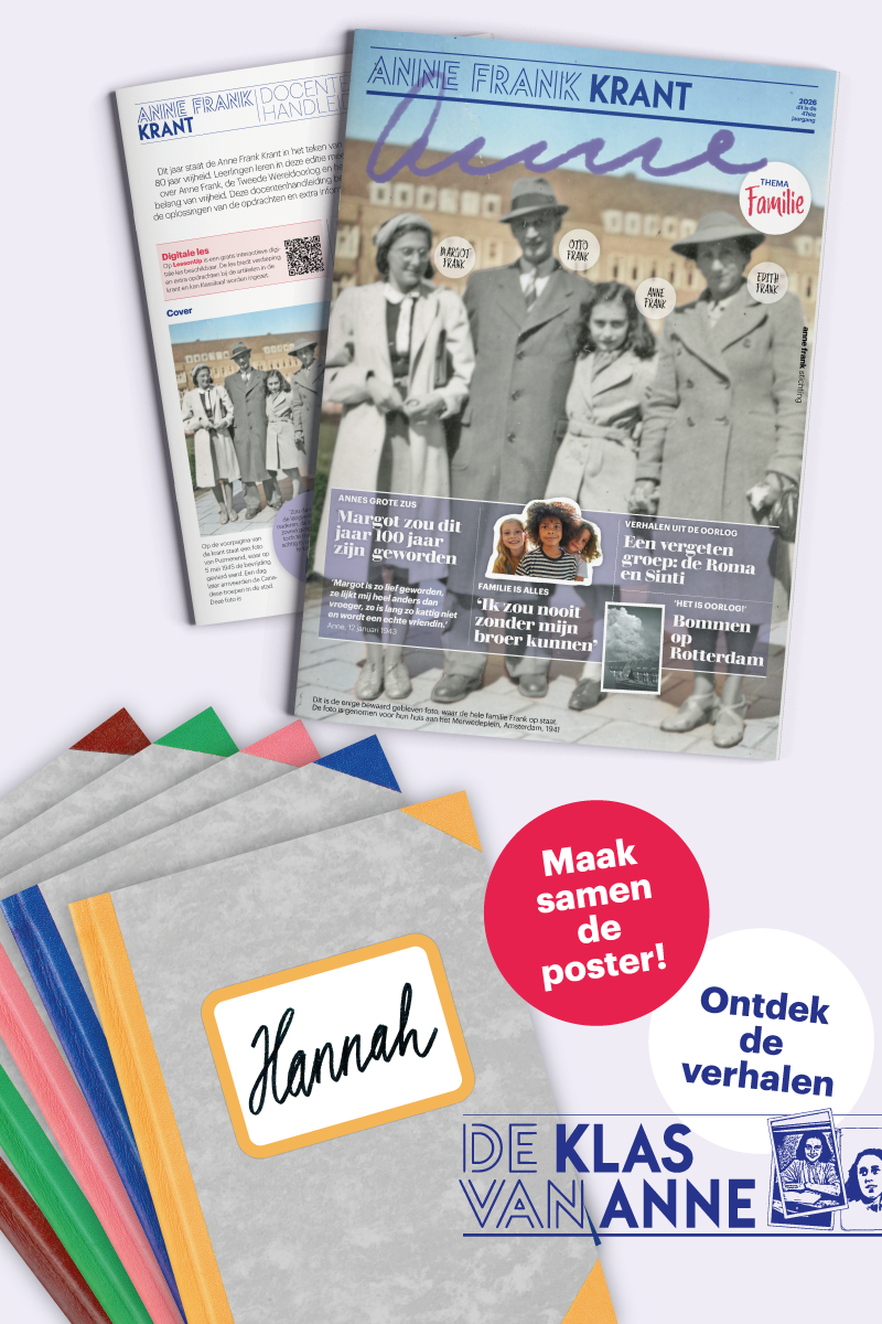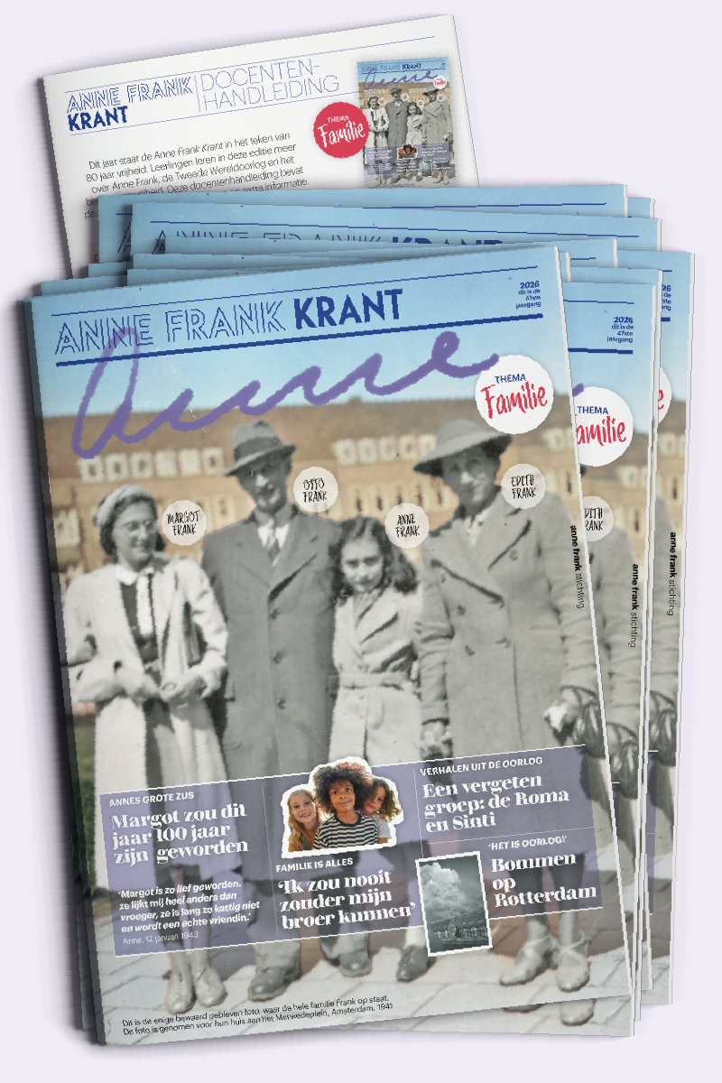 Anne Frank Krant 2026 – Thema familieIn 2026 zou Margot Frank, de zus van Anne, 100 jaar zijn geworden. Vaak blijft zij in de schaduw van haar beroemde zus, maar in deze editie van de Anne Frank Krant krijgen leerlingen ook Margots verhaal te lezen. Het thema ’familie’ staat centraal: hoe hielden families stand in de oorlogsjaren, en wat betekent familie vandaag de dag voor kinderen in oorlogstijd?