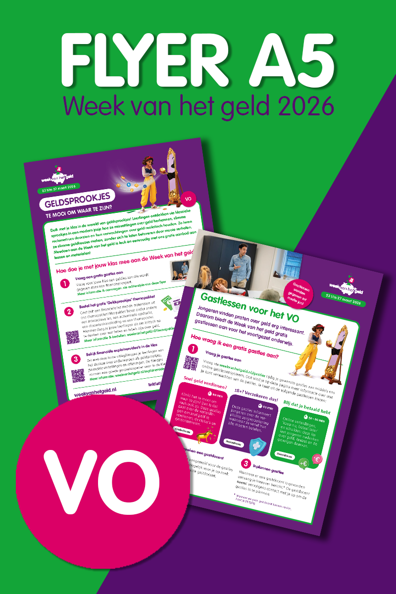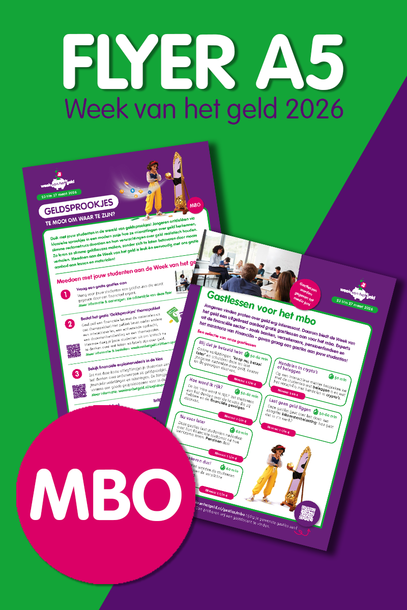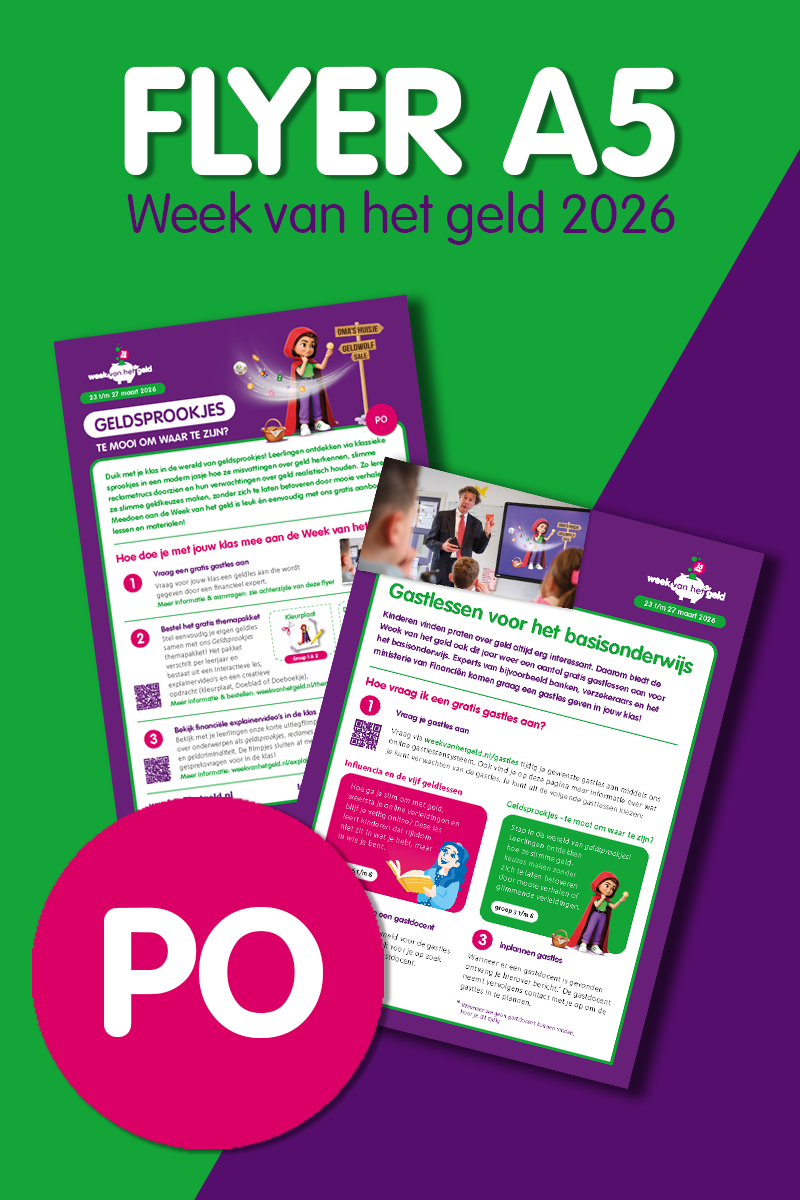 BestelpaginaZet het in je agenda: van 23 t/m 27 maart 2026 is de 15e editie van de Week van het geld! Tijdens deze projectweek voor het onderwijs (po, vo en mbo) ontdekken jongeren via klassieke sprookjes in een modern jasje hoe ze verstandige keuzes maken, zonder zich te laten betoveren door 'te mooie verhalen' over geld. Zo twijfelt Roodkapje of ze naar oma gaat of kiest voor de sale, terwijl Sneeuwwitje wordt verleid door de finfluencer-heks die haar met een bitcoin-appel gouden bergen belooft.